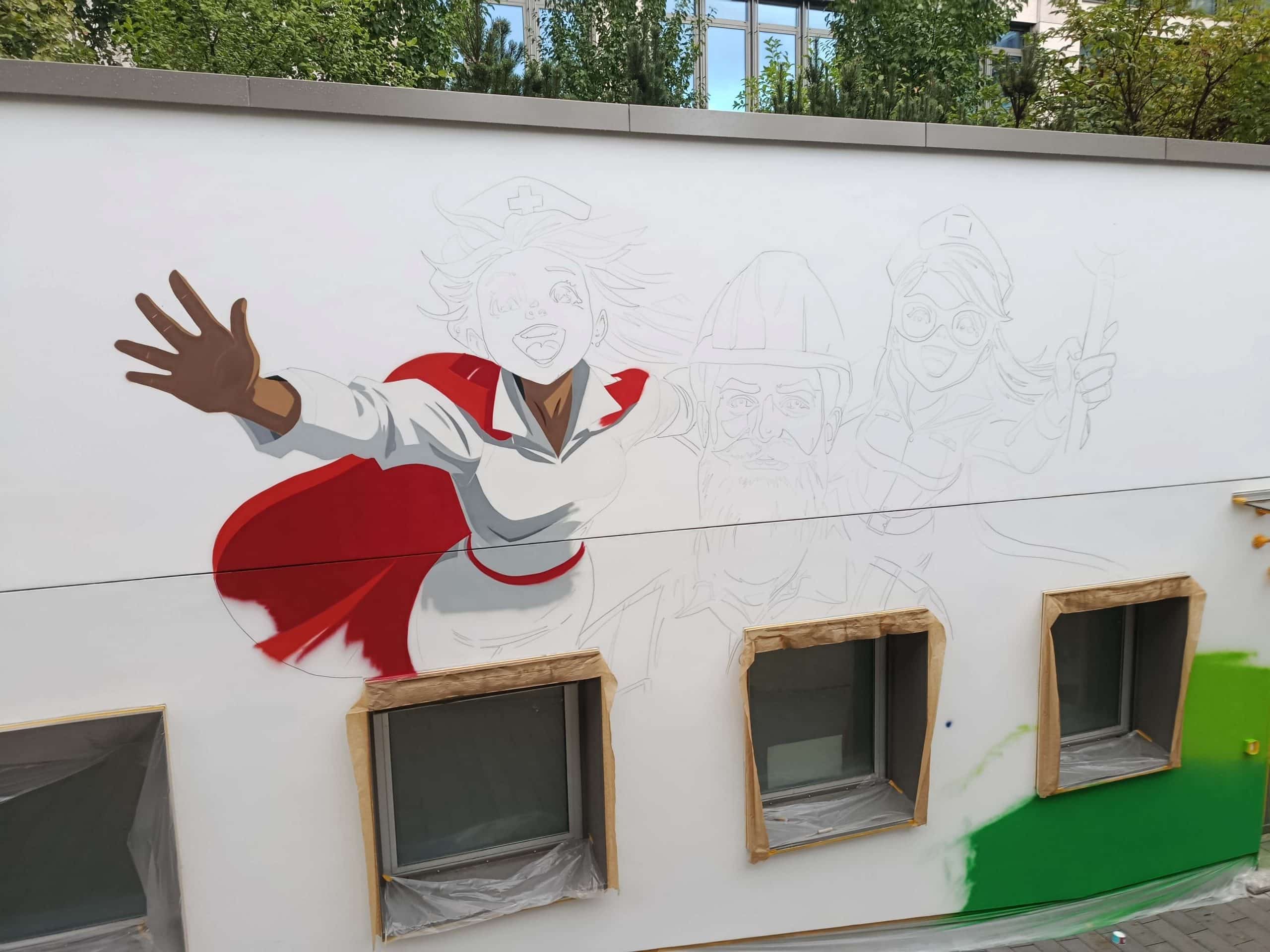 Zu unserer Nachbarschaft am Ostbahnhof gehören die Deutsche Bahn, die Bundespolizei, die Bayerische Polizei, die Berufsfeuerwehr und die Freiwillige Feuerwehr München. Sie alle machen einen wesentlichen Teil unserer sozialen Infrastruktur aus. Wir wollten diese Berufsgruppen auf dem Graffiti abbilden, um ihnen unsere große Wertschätzung einmal richtig groß zu zeigen. Als wir gerade am Motiv tüftelten, fragte das städtische Gesundheitsreferat bei der GVG nach einer Wandfläche, die sich für die Rekrutierung von Pflegekräften eignet. Auf einmal war allen Beteiligten klar, was das Graffiti werden sollte: eine Hommage an Menschen in systemrelevanten Berufen, einschließlich dem Gesundheitsbereich. Und das Graffiti sollte ein sympathischer Eyecatcher werden, um personelle Verstärkung für diese Berufsgruppen zu gewinnen.