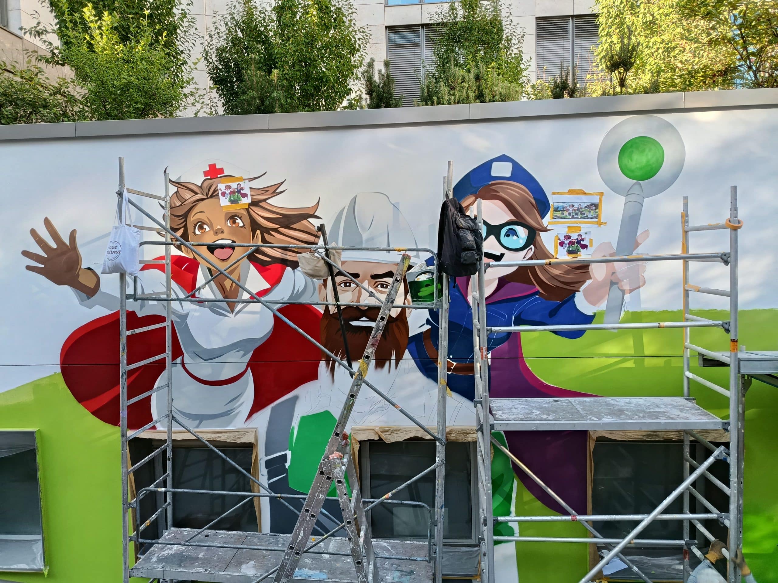 Bert: Ich finde es schön, dass die Leute hier stehenbleiben und sich von der Wand eine Geschichte erzählen lassen. Jeder zieht hier für sich was raus. Jeder interpretiert Details auf seine Weise, aber unterm Strich kommt die eine Botschaft wohl an: Die systemrelevanten Berufe brauchen mehr Aufmerksamkeit. Und frische Kräfte.