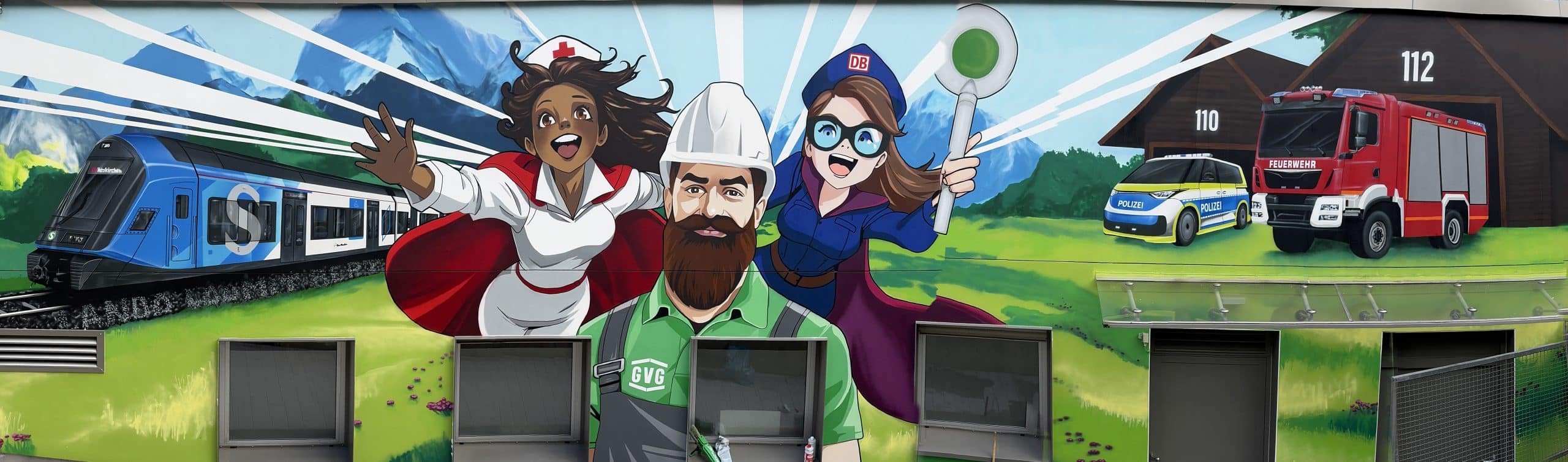 Zu unserer Nachbarschaft am Ostbahnhof gehören die Deutsche Bahn, die Bundespolizei, die Bayerische Polizei, die Berufsfeuerwehr und die Freiwillige Feuerwehr München. Sie alle machen einen wesentlichen Teil unserer sozialen Infrastruktur aus. Wir wollten diese Berufsgruppen auf dem Graffiti abbilden, um ihnen unsere große Wertschätzung einmal richtig groß zu zeigen. Als wir gerade am Motiv tüftelten, fragte das städtische Gesundheitsreferat bei der GVG nach einer Wandfläche, die sich für die Rekrutierung von Pflegekräften eignet. Auf einmal war allen Beteiligten klar, was das Graffiti werden sollte: eine Hommage an Menschen in systemrelevanten Berufen, einschließlich dem Gesundheitsbereich. Und das Graffiti sollte ein sympathischer Eyecatcher werden, um personelle Verstärkung für diese Berufsgruppen zu gewinnen.